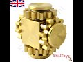 Solid brass fidget toy for adults from skilltoyz.com. This is a beautifully engineered unusual executive fidget toy or desk gadget. The four brass gears are interlinked, meaning that when you spin one gear, they all spin in unison. Two of the circular finger pads allow the whole cube to spin on one axis, like a finger spinner. So you can spin the gears and spin the cube simultaneously! Sold with a small hard shell case.